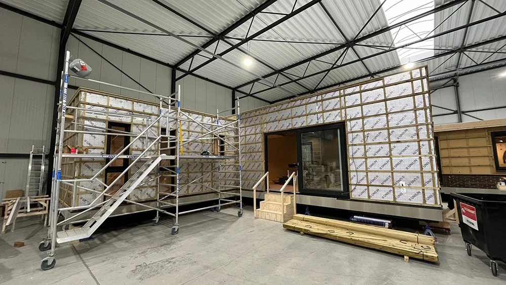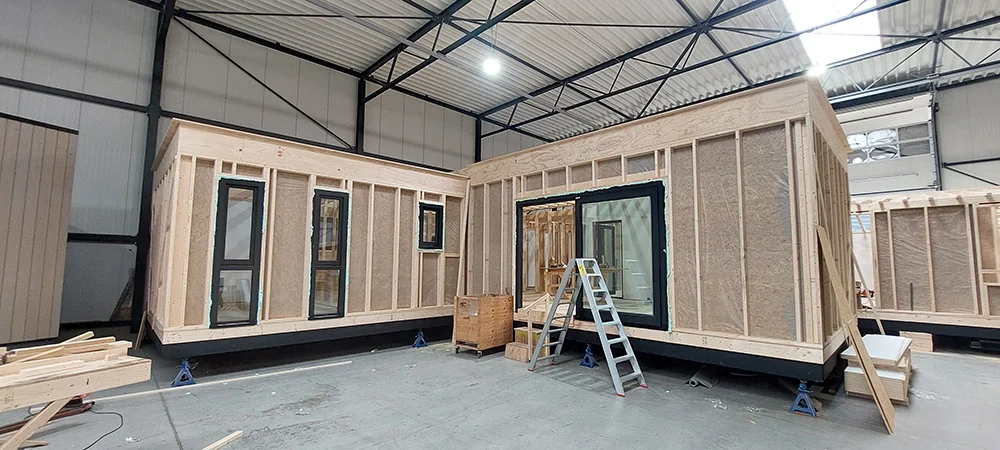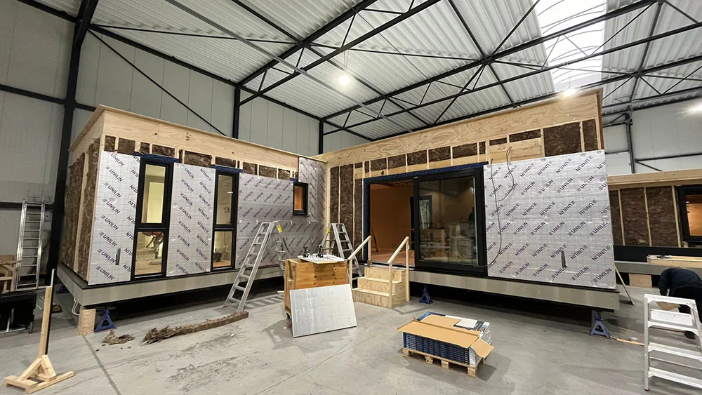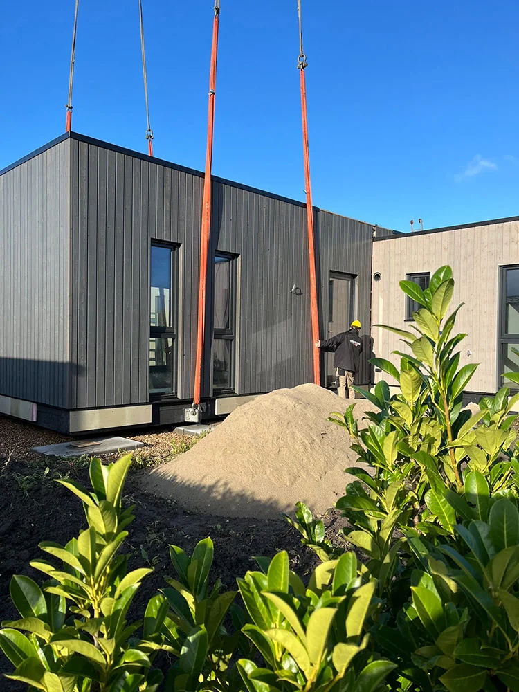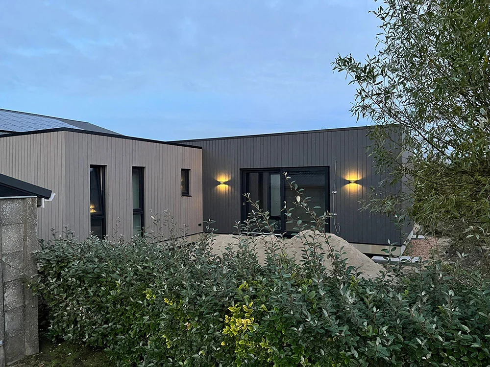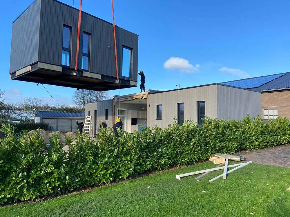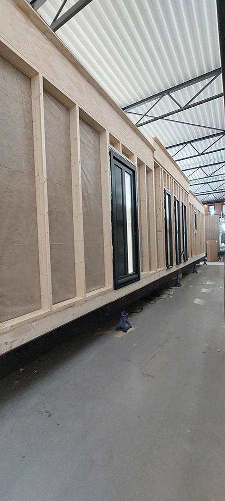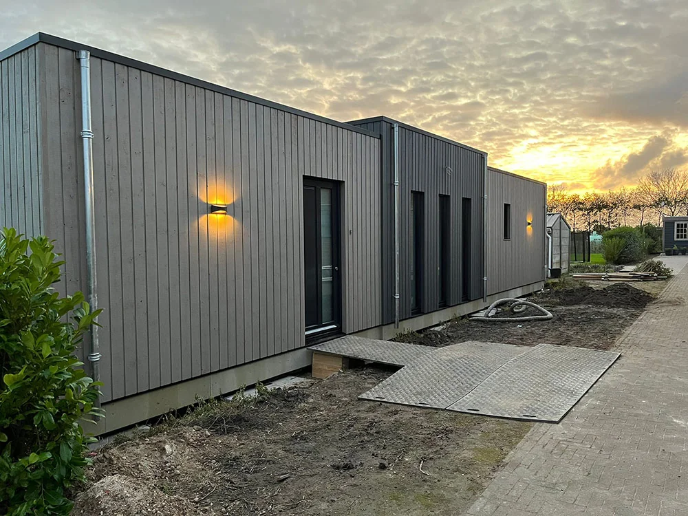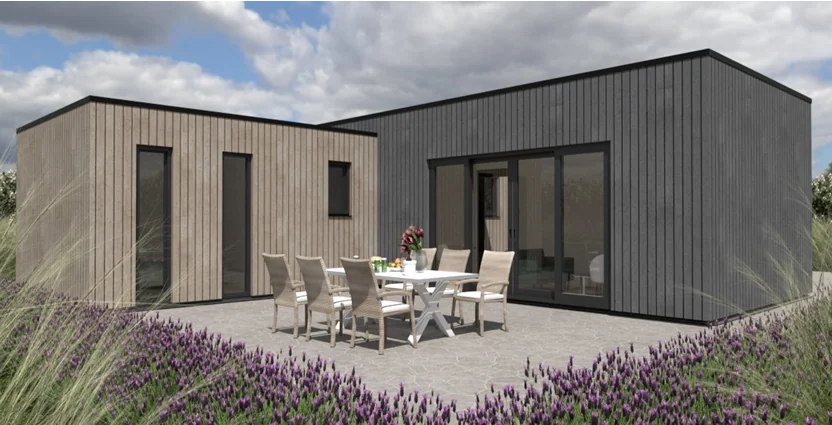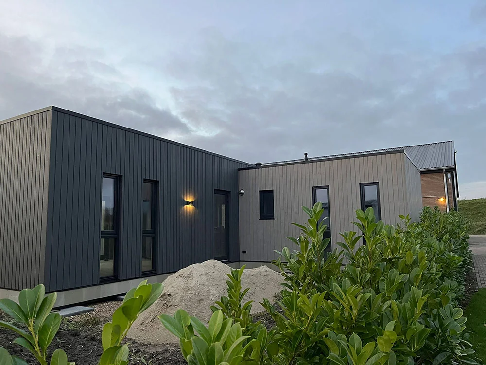 Permanente (zorg)woning 113 m2 in Wissenkerke. Deze ruime prefab woning komt bij een boerenbedrijf en camping in het Zeeuwse Wissenkerke te staan. Het gaat om een woning in T-vorm van 113 m2. De inrichting bestaat uit 2 ruime slaapkamers met inbouwkasten, een badkamer, een techniekruimte, een ruime woonkamer en keuken met kookeiland. De woning wordt volledig in hout uitgevoerd, zoals houten kozijnen en houten gevelbekleding. Naar wens van de klant wordt de keuken met luxe apparatuur uitgevoerd zoals een wijnkoeler, een Quooker en een royaal kookeiland inclusief kookplaat met ingebouwde afzuiging. Deze (zorg)woning mag permanent blijven staan, hiervoor is een vergunning aangevraagd. Dit is een ander principe dan bij een (pré-)mantelzorgwoning waarbij het wordt gezien als tijdelijke bebouwing. De woning wordt gebouwd volgens het nieuwe vergunningsprincipe wat sinds 2024 geldt (WKB) en wordt in samenwerking met een bouwkundig bureau en externe bouwborger begeleid.