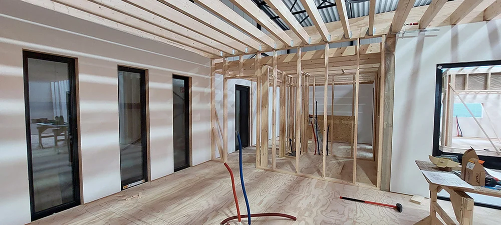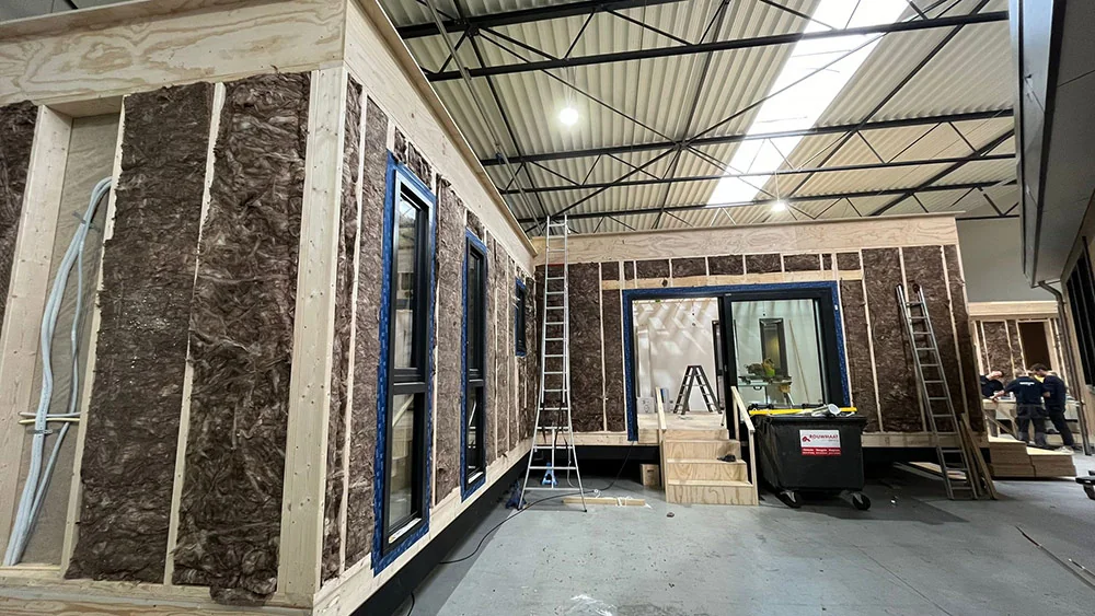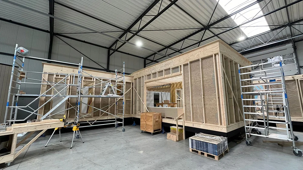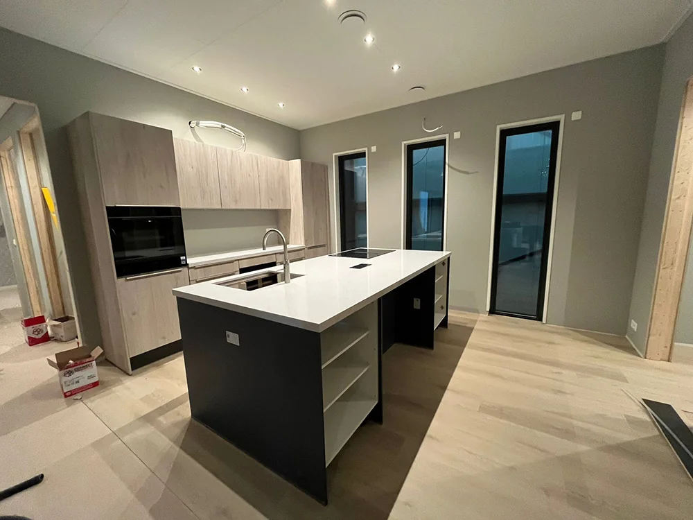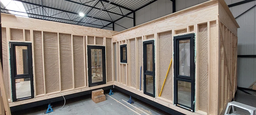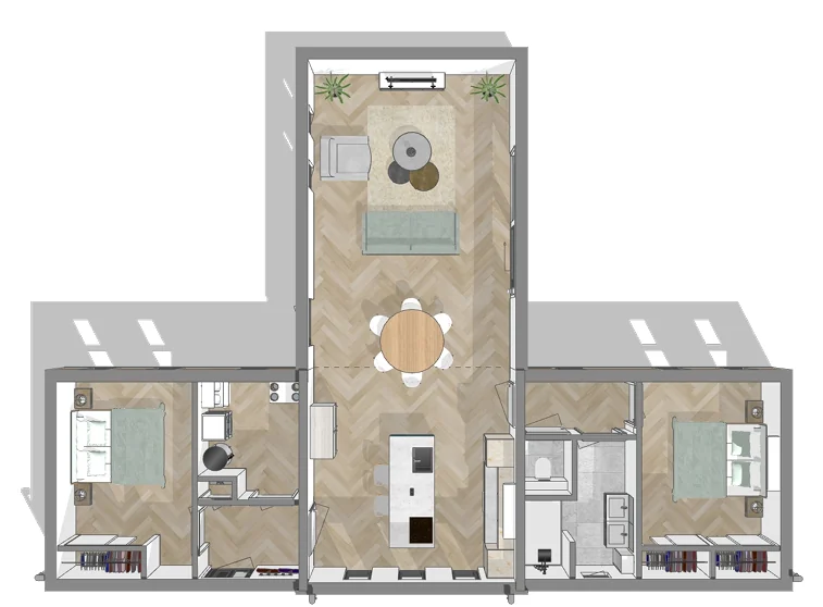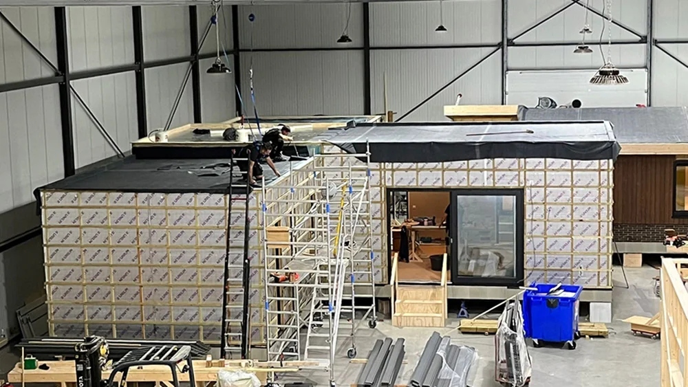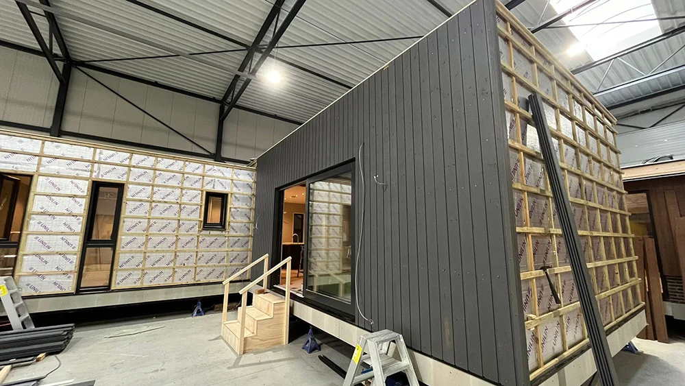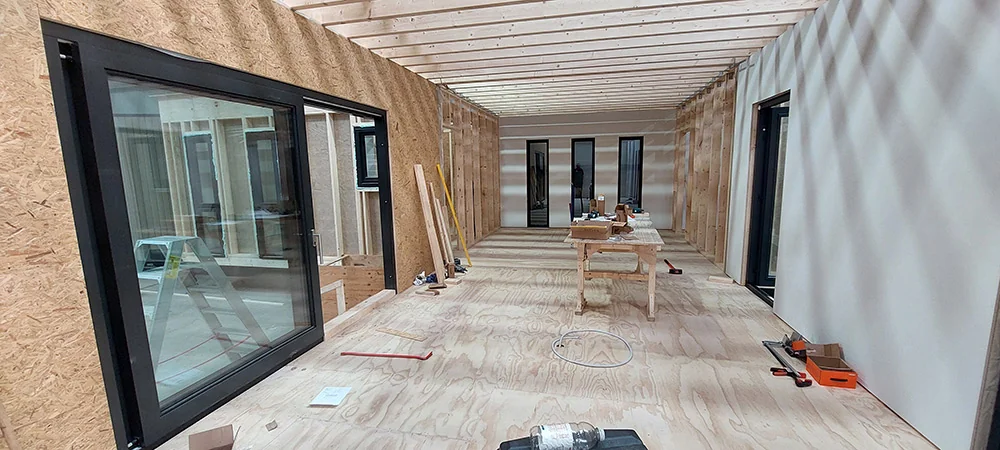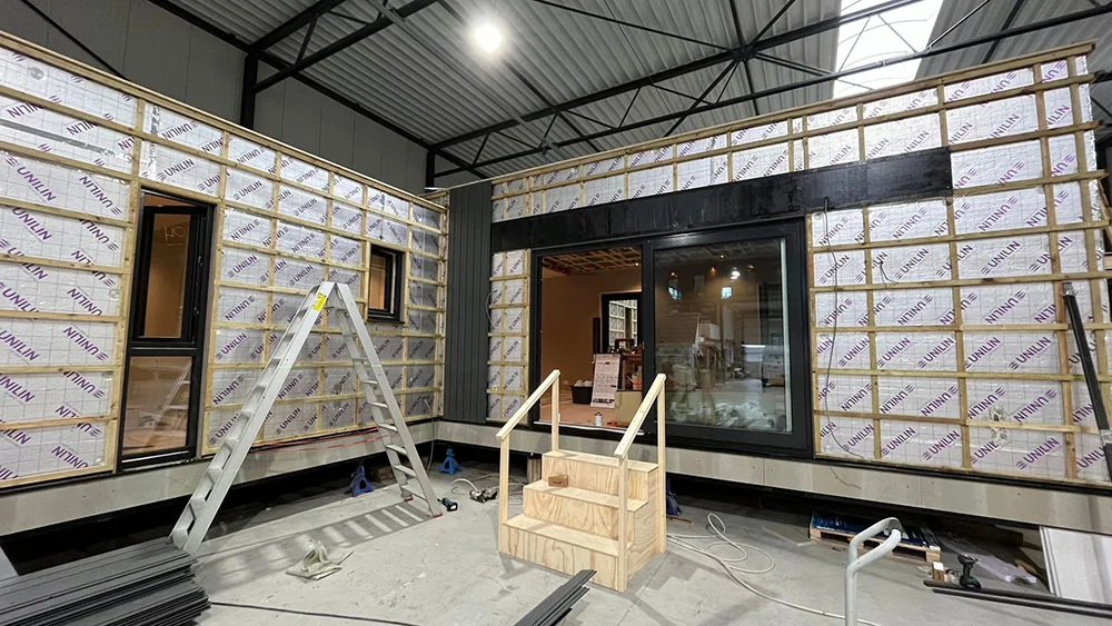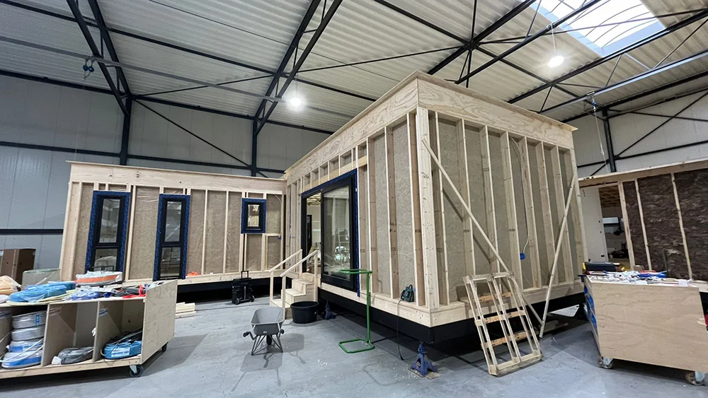 Permanente (zorg)woning 113 m2 in Wissenkerke. Deze ruime prefab woning komt bij een boerenbedrijf en camping in het Zeeuwse Wissenkerke te staan. Het gaat om een woning in T-vorm van 113 m2. De inrichting bestaat uit 2 ruime slaapkamers met inbouwkasten, een badkamer, een techniekruimte, een ruime woonkamer en keuken met kookeiland. De woning wordt volledig in hout uitgevoerd, zoals houten kozijnen en houten gevelbekleding. Naar wens van de klant wordt de keuken met luxe apparatuur uitgevoerd zoals een wijnkoeler, een Quooker en een royaal kookeiland inclusief kookplaat met ingebouwde afzuiging. Deze (zorg)woning mag permanent blijven staan, hiervoor is een vergunning aangevraagd. Dit is een ander principe dan bij een (pré-)mantelzorgwoning waarbij het wordt gezien als tijdelijke bebouwing. De woning wordt gebouwd volgens het nieuwe vergunningsprincipe wat sinds 2024 geldt (WKB) en wordt in samenwerking met een bouwkundig bureau en externe bouwborger begeleid.