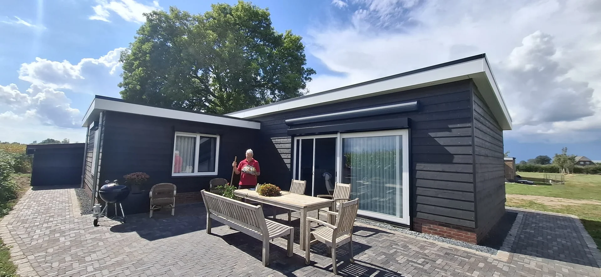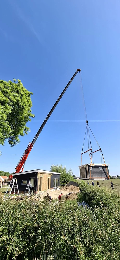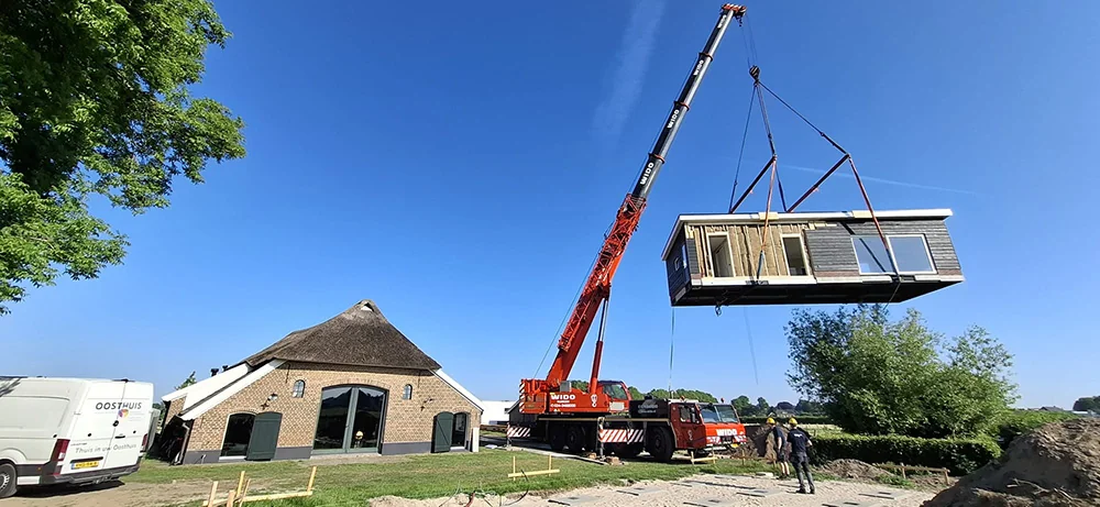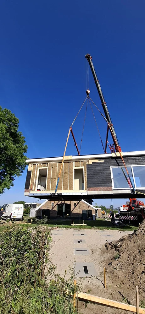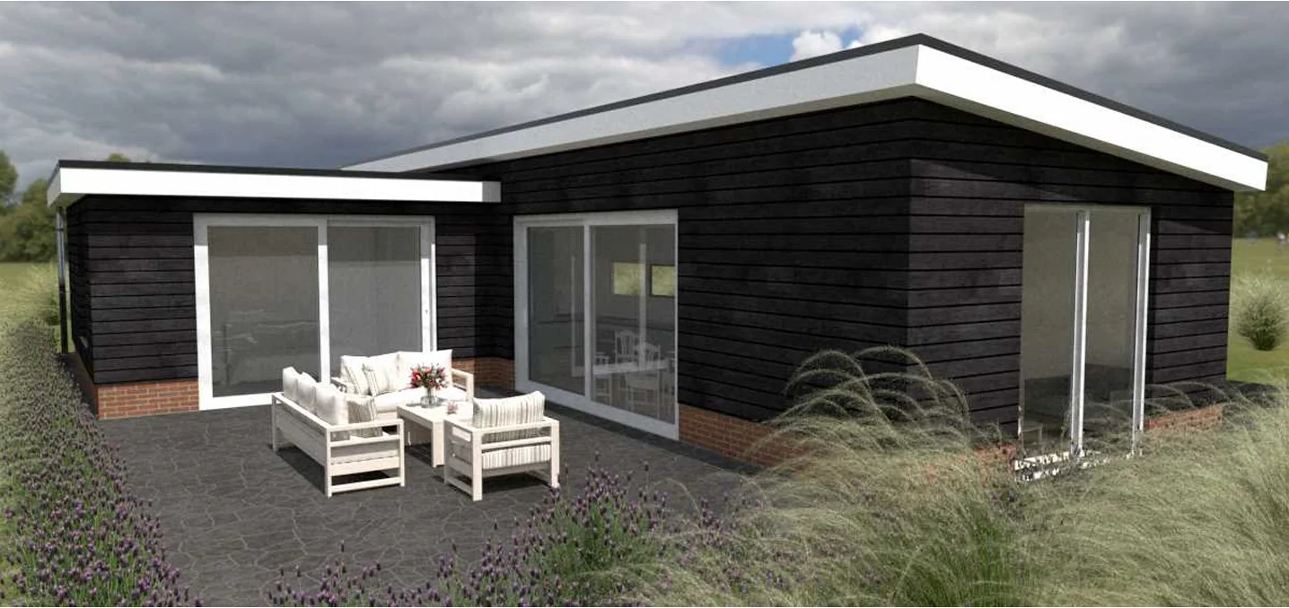 Mantelzorgwoning in Toldijk 95 m2. Deze L-vormige prefab mantelzorgwoning van 95 m² komt bij een monumentale boerderij in Toldijk te staan. Vanwege deze bijzondere situatie was er ondanks de mantelzorg bestemming toch een vergunning nodig. Het ontwerp van de woning is daarom aangepast op de bestaande boerderij en is goedgekeurd door de gemeente. De Oosthuis woning wordt voorzien van twee slaapkamers, een badkamer en suite, een apart toilet met urinoir, luxe open keuken met composiet blad en een ruime bijkeuken voorzien van een verhoogd meubel voor wasmachine en droger. Door de grote schuifpui in de woonkamer wordt er prachtig vrij zicht gecreëerd op de natuur. Met een kacheldoorvoering kunnen deze klanten een houtkachel in de woonkamer plaatsen. Door de combinatie van Zweeds rabat met onderaan steenstrips, zorgt de gevelbekleding voor een landelijke uitstraling. Deze klanten hebben gekozen voor onderhoudsvriendelijke kunststof kozijnen.