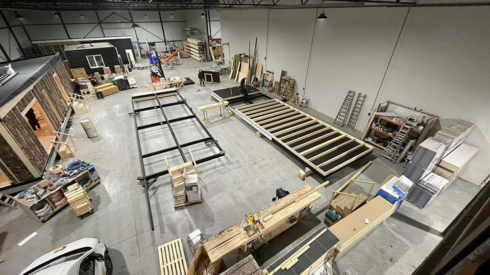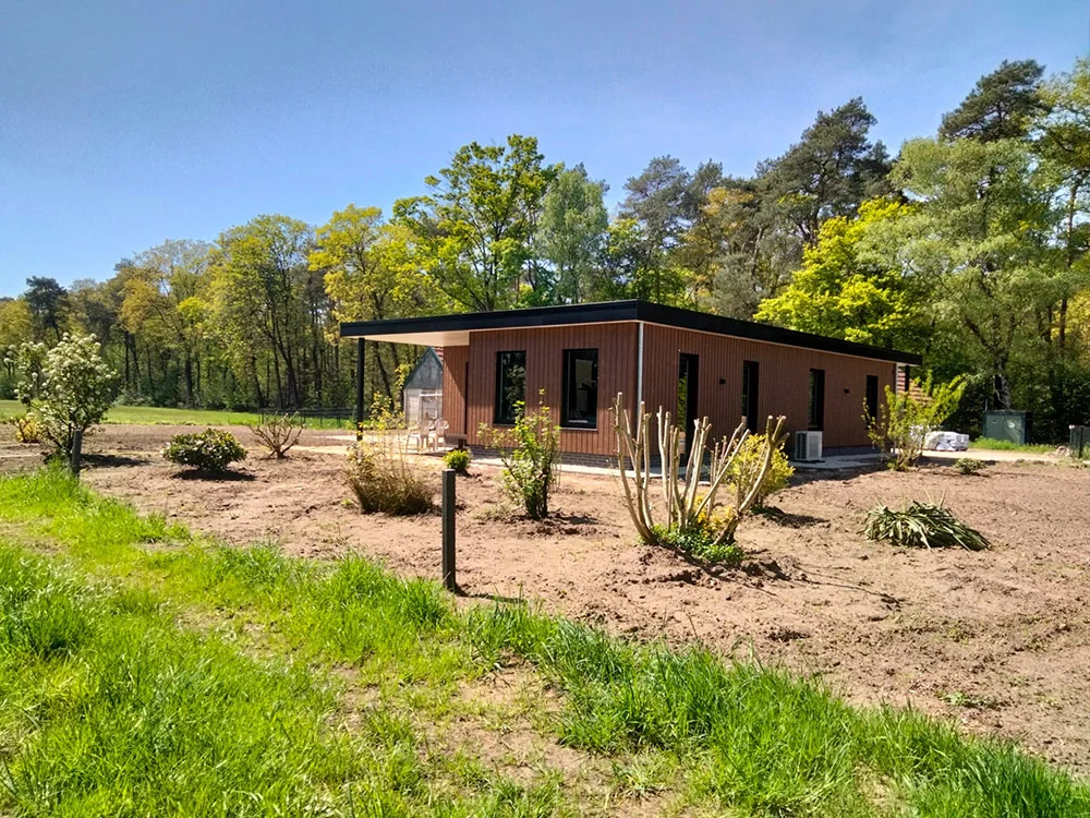 Permanente woning van 122 m2 in Westendorp. Deze permanente woning van 122 m2 heeft een plat dak met overstek en aan beide kopzijden een overkapping. De woning wordt voorzien van 2 tweepersoonslaapkamers, een woonkamer met open keuken met royale lichtinval, een badkamer, apart toilet en een ruime hal met bijkeuken. De bewoners kunnen straks vanuit de keuken rechtstreeks het terras betreden. De huidige woning van deze klanten zal worden gesloopt en wordt vervangen door de nieuwe prefab woning. Dit is een bewuste keuze, omdat nieuwbouw duurzamer, efficiënter en toekomstbestendiger is dan renovatie. Zoals te zien is op het ontwerp wordt de woning bekleed met een houten gevel, steenstrips aan de onderzijde en krijgt ze kunststof kozijnen en boeiranden. De woning krijgt uiteindelijk energieklasse A+++. Leuk weetje: Toevallig hebben wij al eerder in dezelfde straat een prefab woning mogen plaatsen, een beginnende Oosthuis buurt dus!