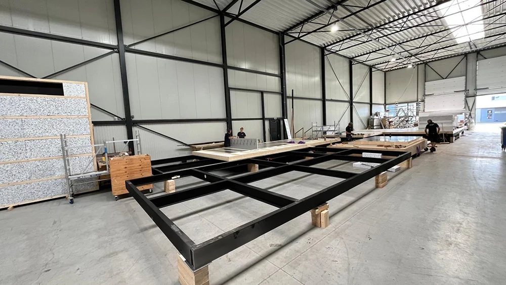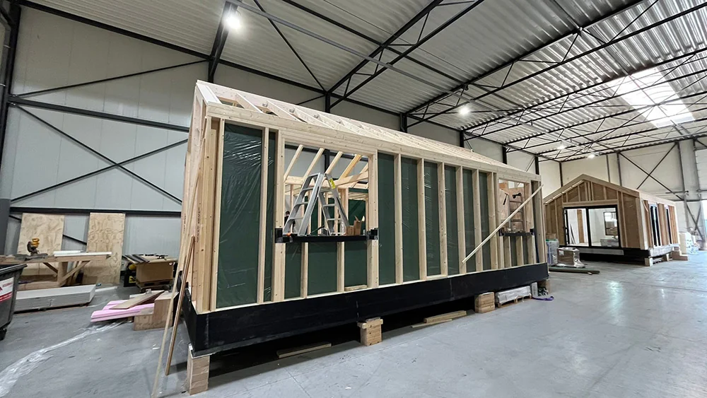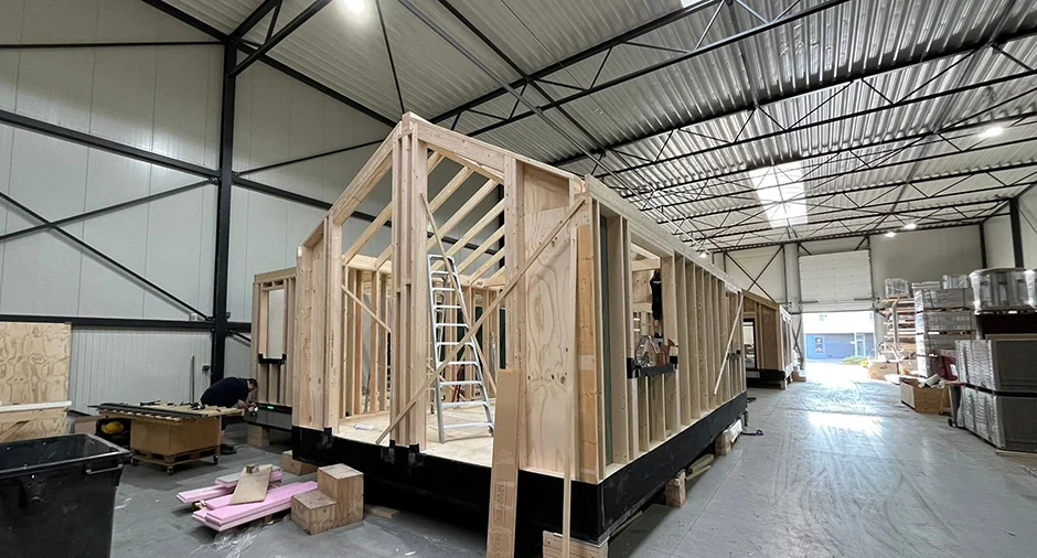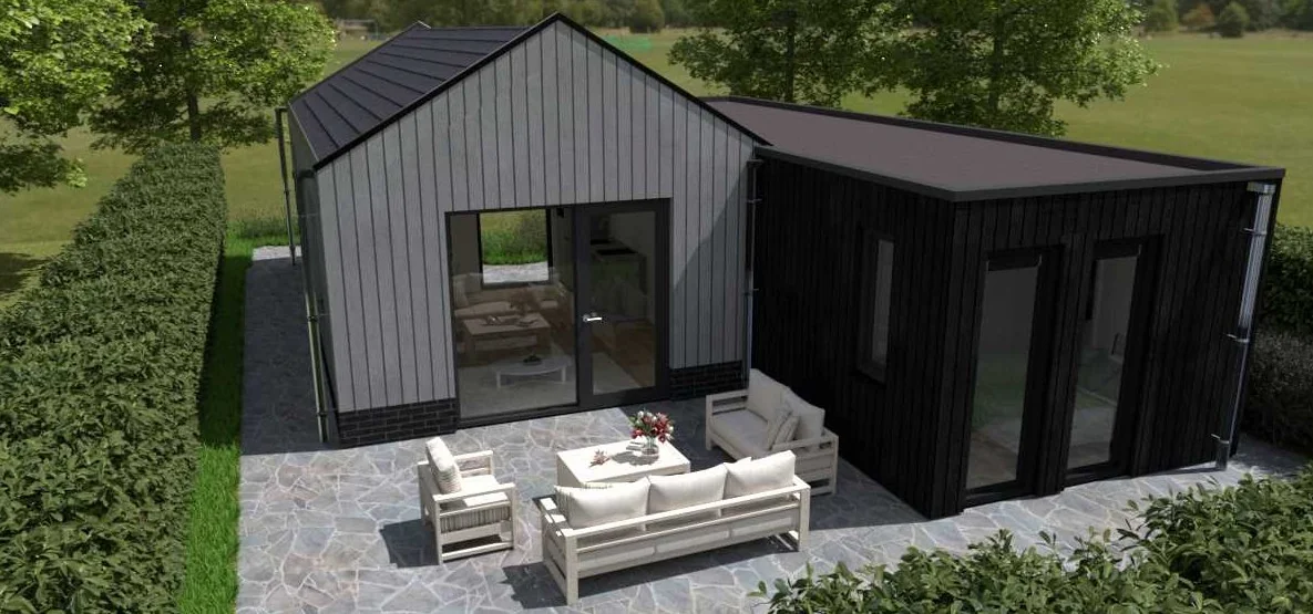 Permanente woning 80 m² in Wehl. De gemeente Doetinchem heeft in Wehl een nieuw woongebied gecreëerd genaamd Heideslag. In dit gebied zullen verschillende woningtypen gebouwd/geplaatst worden om het levendige en dorpse karakter zoveel mogelijk vorm en inhoud te geven. De klanten die deze prefab woning door ons laten bouwen, mogen zich straks ook trotse inwoners van woongebied Heideslag noemen. Zij hebben gekozen voor een moderne permanente woning van 80 m². De woning wordt uitgevoerd in een Z-vorm en deels met een zadeldak. Het dak zal bekleed worden met een vlakke dakpan, dit geeft een unieke en frisse uitstraling. Onder het zadeldak zal het woongedeelte een hoog plafond krijgen, hiermee wordt een ruimtelijk effect gecreëerd. Zoals op de plattegrond te zien is bevat de woning een ruime woonkamer met rechte open keuken. De gang is de verbindende factor tussen de rest van de ruimtes zoals de slaapkamer, badkamer en apart toilet. Ook is er rekening gehouden met extra ruimte voor bijvoorbeeld een kantoor.