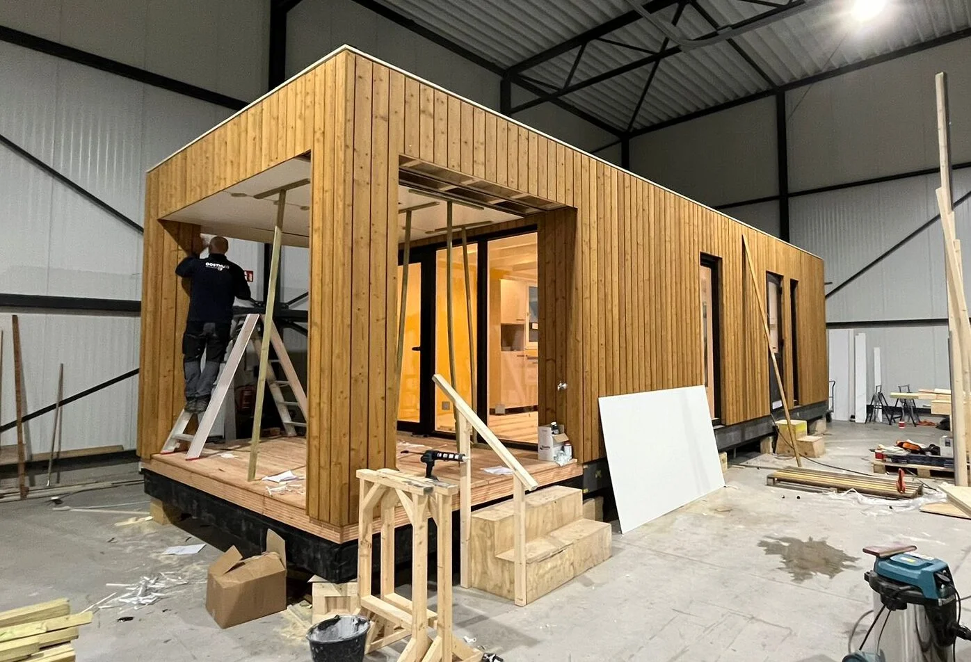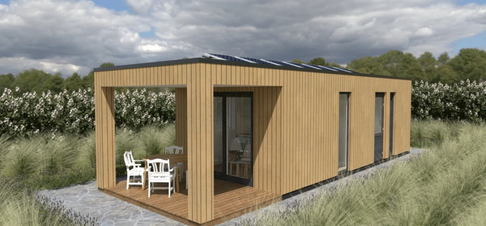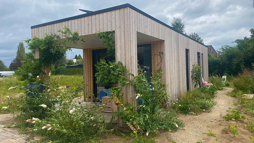 Tiny house 36m2 in Doetinchem. In het oostelijk deel van Wijnbergen wordt een nieuw woongebied ontwikkeld: De Kwekerij. Wijnbergen De Kwekerij – grenzend aan de Kapperskolk – krijgt een groene uitstraling en grote biodiversiteit. Er komen ongeveer 135 energie neutrale woningen, gebouwd met respect voor de natuur (denk aan houten gevels, grasdaken/daktuinen). Wij gaan hier een tiny house plaatsen van 36 m2 in I-vorm. De woning is onder andere voorzien van 1 slaapkamer, een mooie open keuken en een warmtepomp boiler. Om te voldoen aan de gestelde eisen van deze groene wijk is er naast het ontwerp van het tiny prefab huis ook een tuinontwerp gemaakt door Bloemendal tuin- & landschapsontwerp.