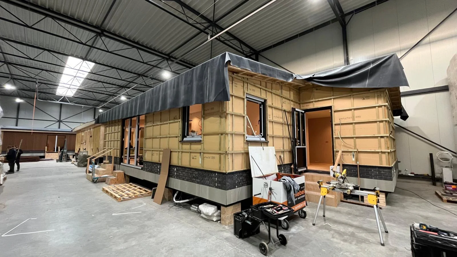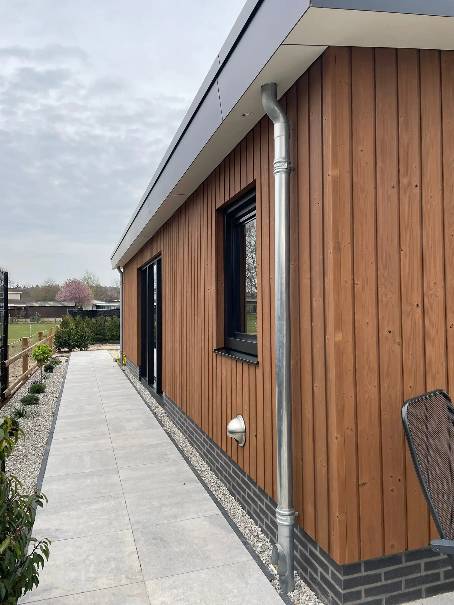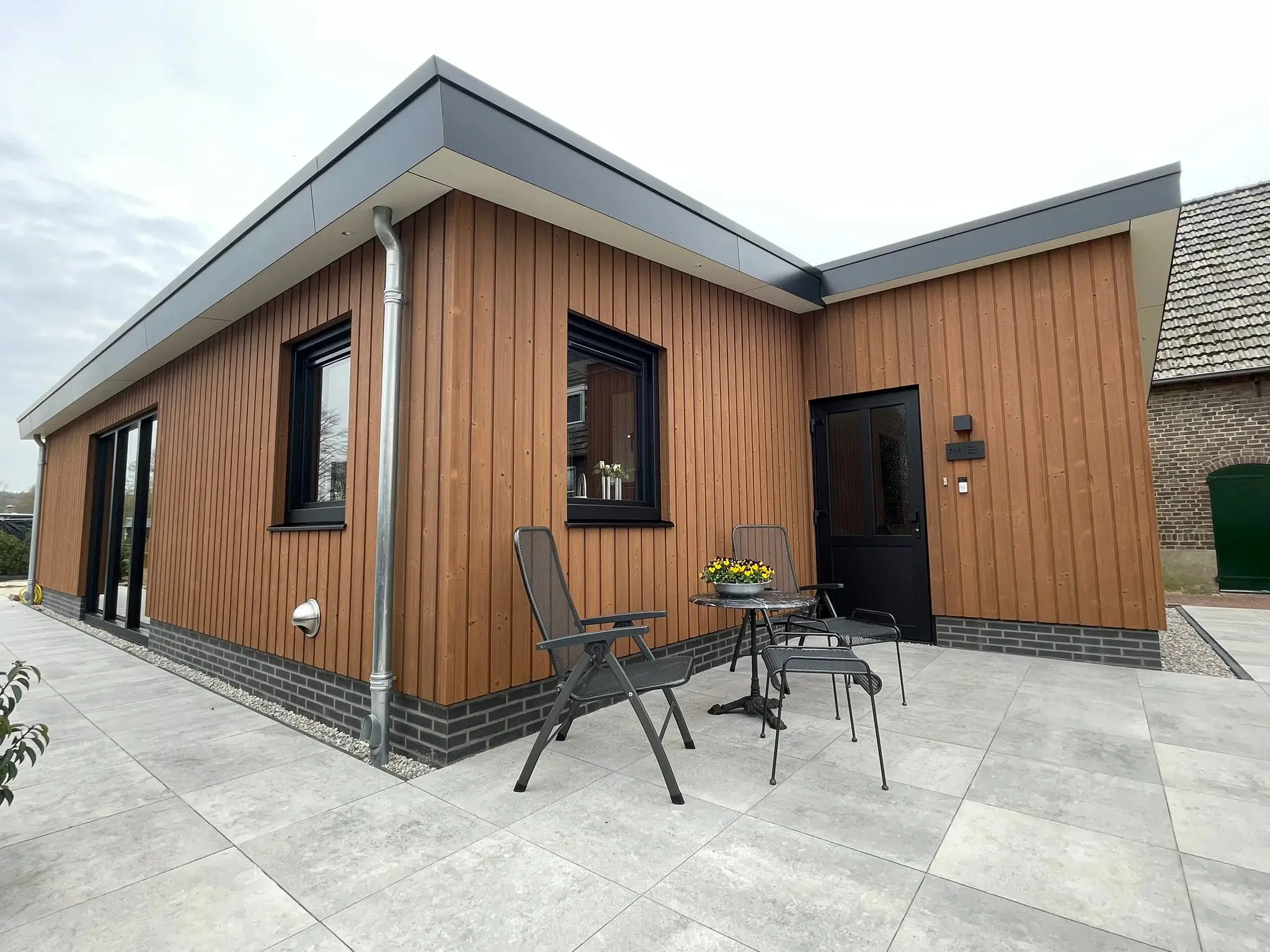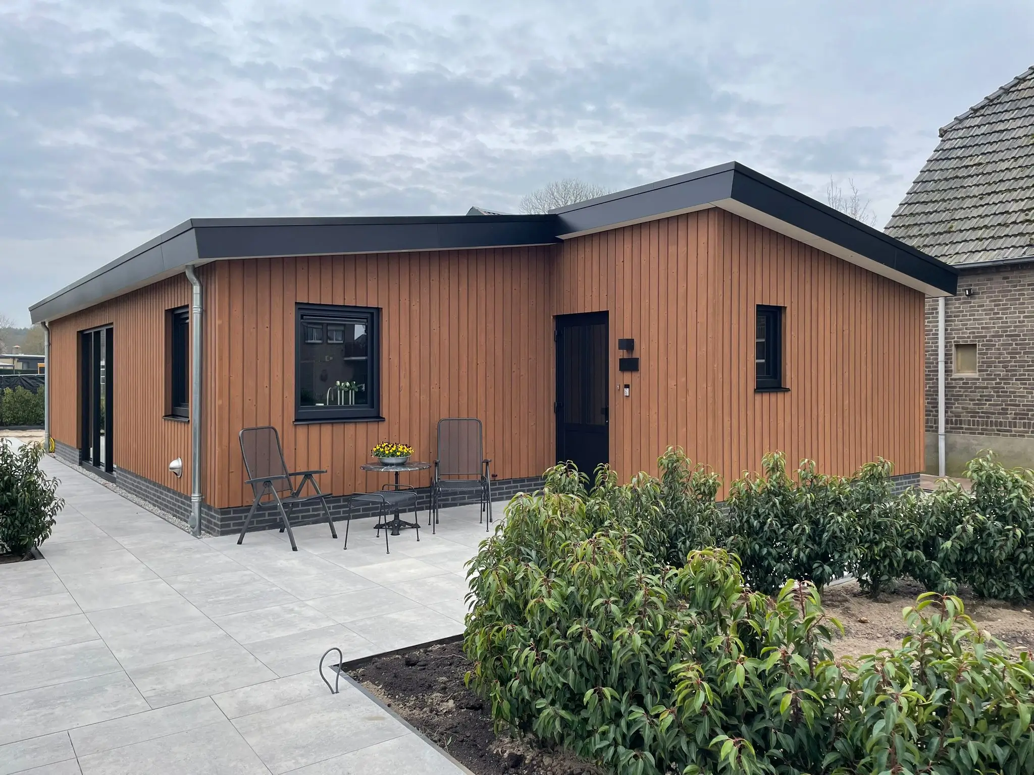 Pré-mantelzorgwoning 100 m² in Beek. Deze prefab pré-mantelzorgwoning van 100 m² komt in Beek te staan. Zichtbaar aan de buitenkant zijn de houten gevelbekleding, de onderhoudsvriendelijke kunststof kozijnen en donkere steenstrips aan de onderzijde van het huis. In de prefab woning bevindt zich een bijkeuken, apart toilet, 2 grote slaapkamers met daartussen de badkamer. De woonkamer met open keuken zijn praktisch en ruim opgezet, vanuit de woonkamer kunnen de klanten door de schuifpui direct het toekomstige terras betreden.