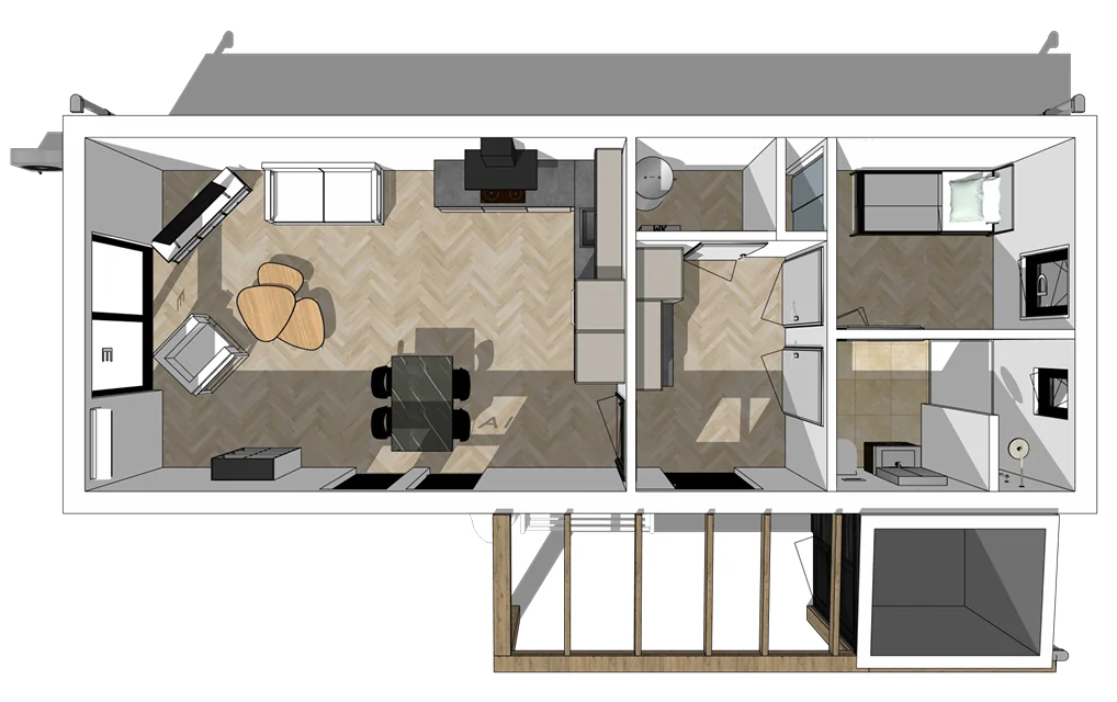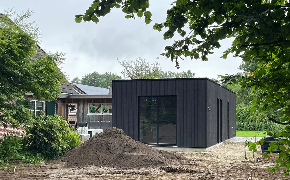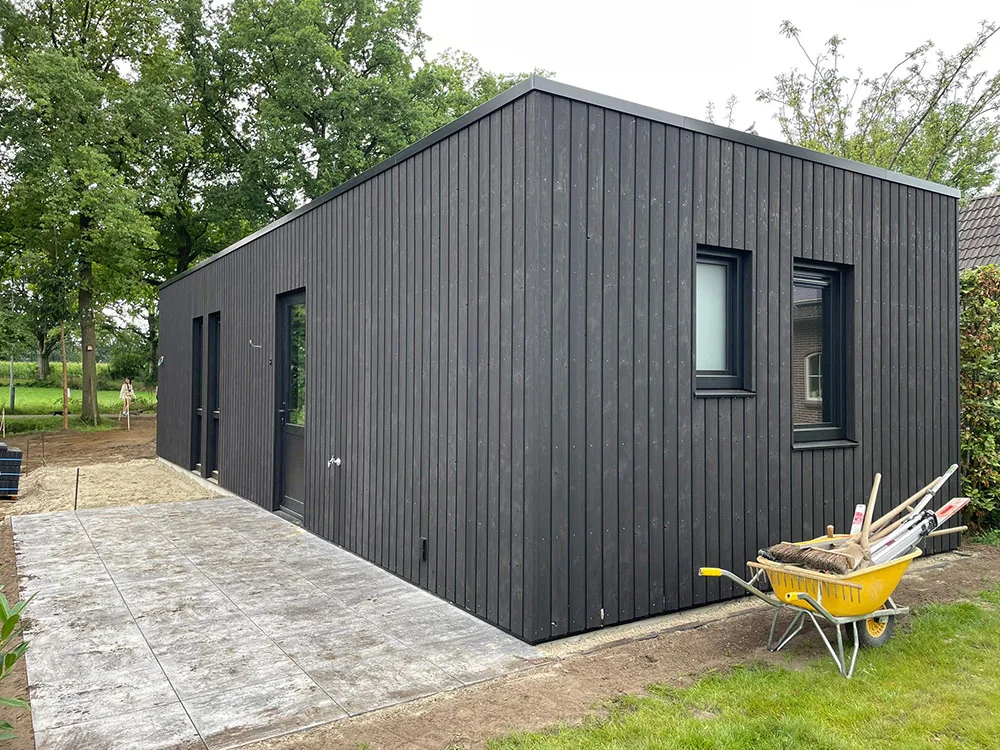 Pré-mantelzorgwoning in Aalten van 55 m2. Voor deze klant mogen we een pré-mantelzorgwoning van 55 m2 in I-vorm bouwen. De compacte maar moderne woning zal voorzien worden van een woonkamer met open keuken, één slaapkamer, een badkamer en een ruime hal. Aan de buitenzijde is gekozen voor donkere houten gevelbekleding in combinatie met donkere kunststof kozijnen met een staal look. Dit zorgt voor een moderne maar toch huiselijke uitstraling, zeker in combinatie met de houten veranda aan de lange zijde.